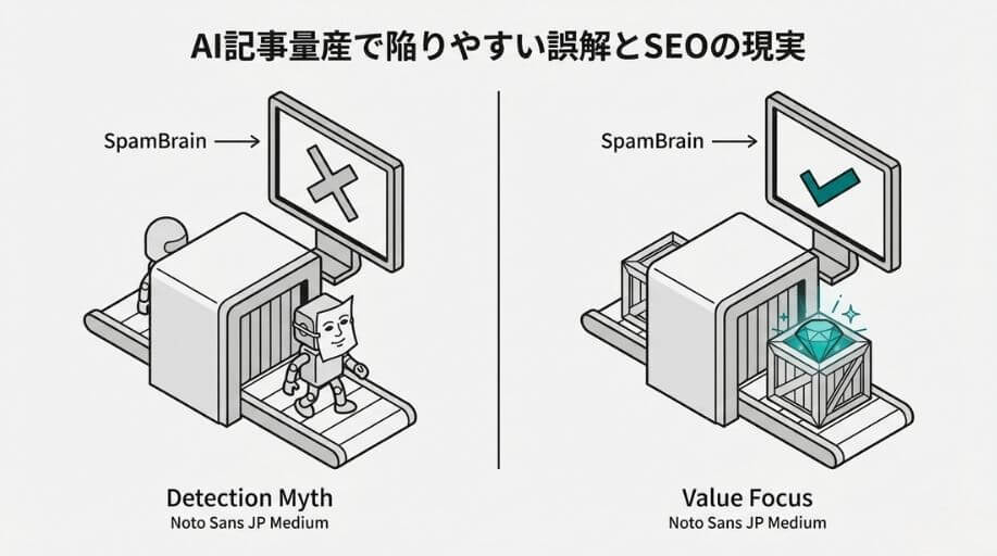 AI記事の量産に取り組む際、多くの方が陥る誤解があります。これらの誤解を放置したまま量産を続けると、期待した成果が得られないだけでなく、サイトに取り返しのつかないダメージを与える恐れもあります。ここでは代表的な誤解と、2026年現在のSEOにおける現実を整理します。