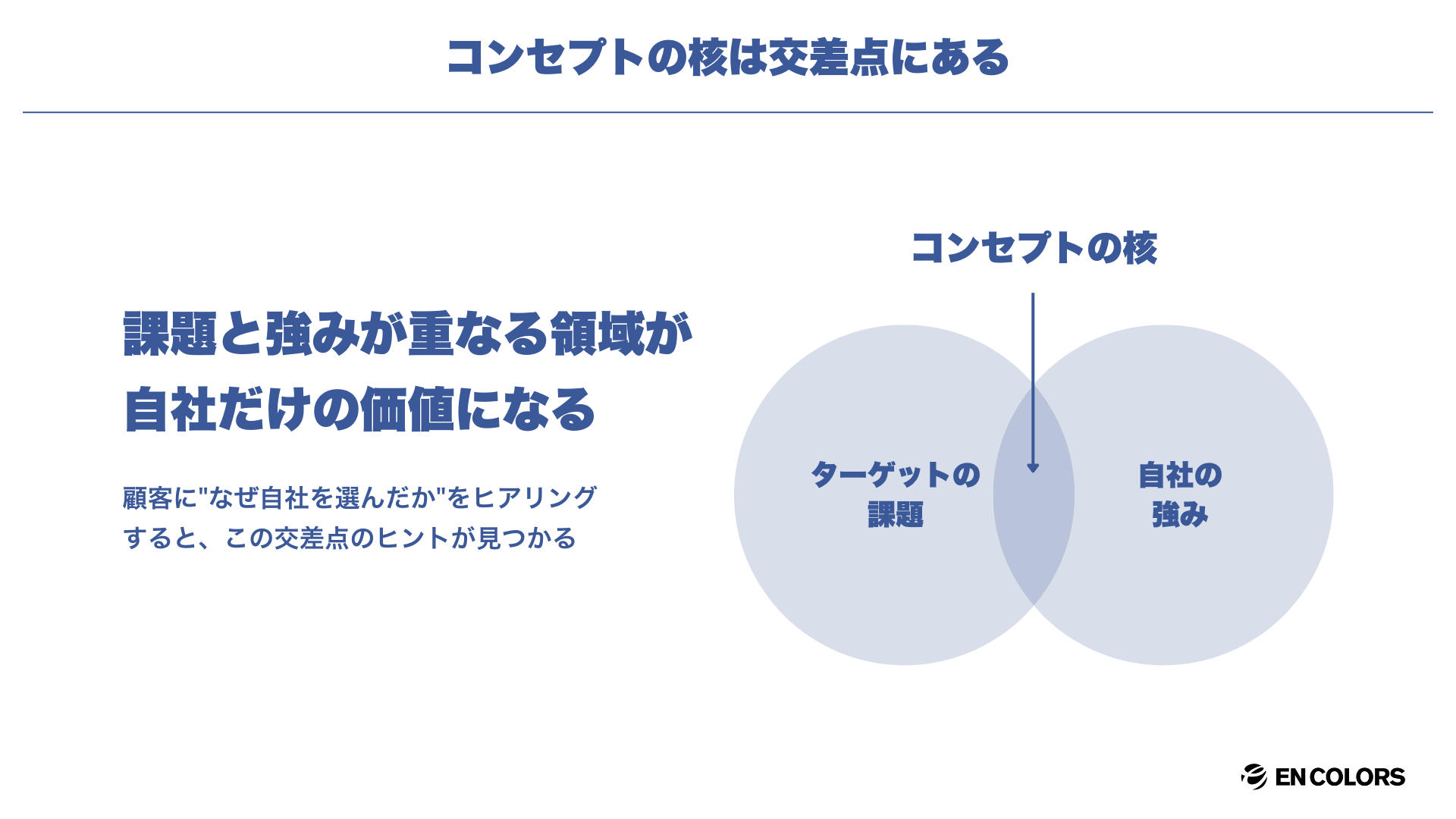 この2つが重なるポイントこそ、自社だけが語れる独自の価値提供領域であり、コンセプトの中核に据えるべき部分です。たとえば、製造業向けのITサービスを提供する企業なら「工場現場の課題を知り尽くしたエンジニア集団が届ける、製造DXの実践メディア」のように表現できます。
