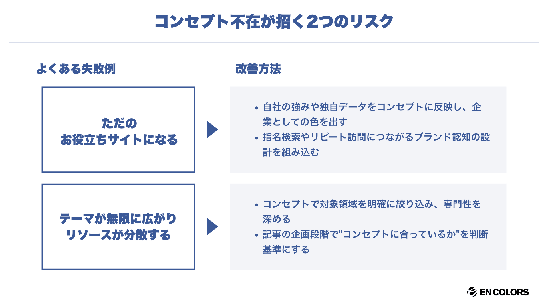 また、コンセプトがないと記事のテーマが無限に広がりやすくなり、リソースが分散してしまう点もリスクです。限られたリソースで成果を最大化するためにも、コンセプトで対象領域を絞り込む必要があります。