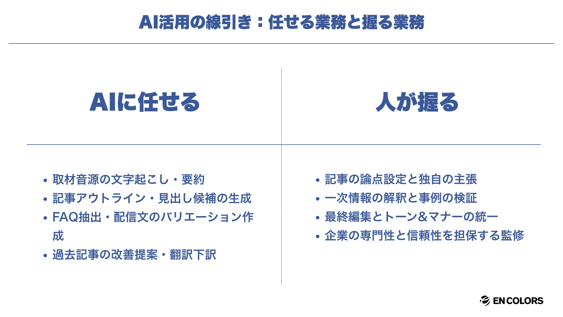 一方で、記事の論点設定、一次情報の解釈、独自の主張、事例の検証、最終編集は必ず人が担うべき領域です。これらは「何を言うか」「なぜそう言えるのか」を決める工程であり、企業の専門性と信頼性を左右する最重要プロセスです。