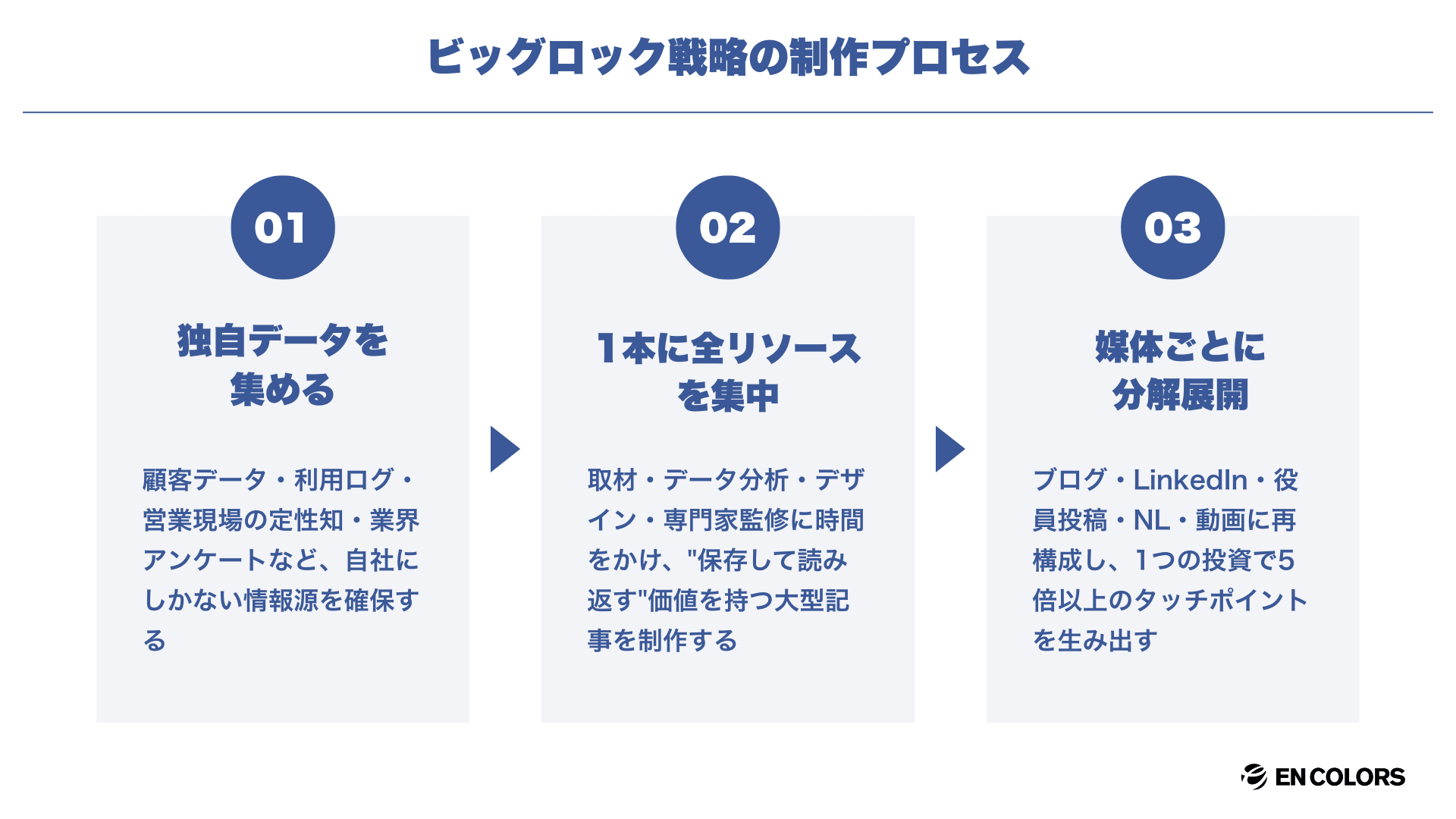 基本を押さえたうえで取り入れたいのが「ビッグロック戦略」です。これは月1本の大型コンテンツに集中し、自社の独自データや現場知見で圧倒的な差別化を図るBtoBオウンドメディアの運用方法です。