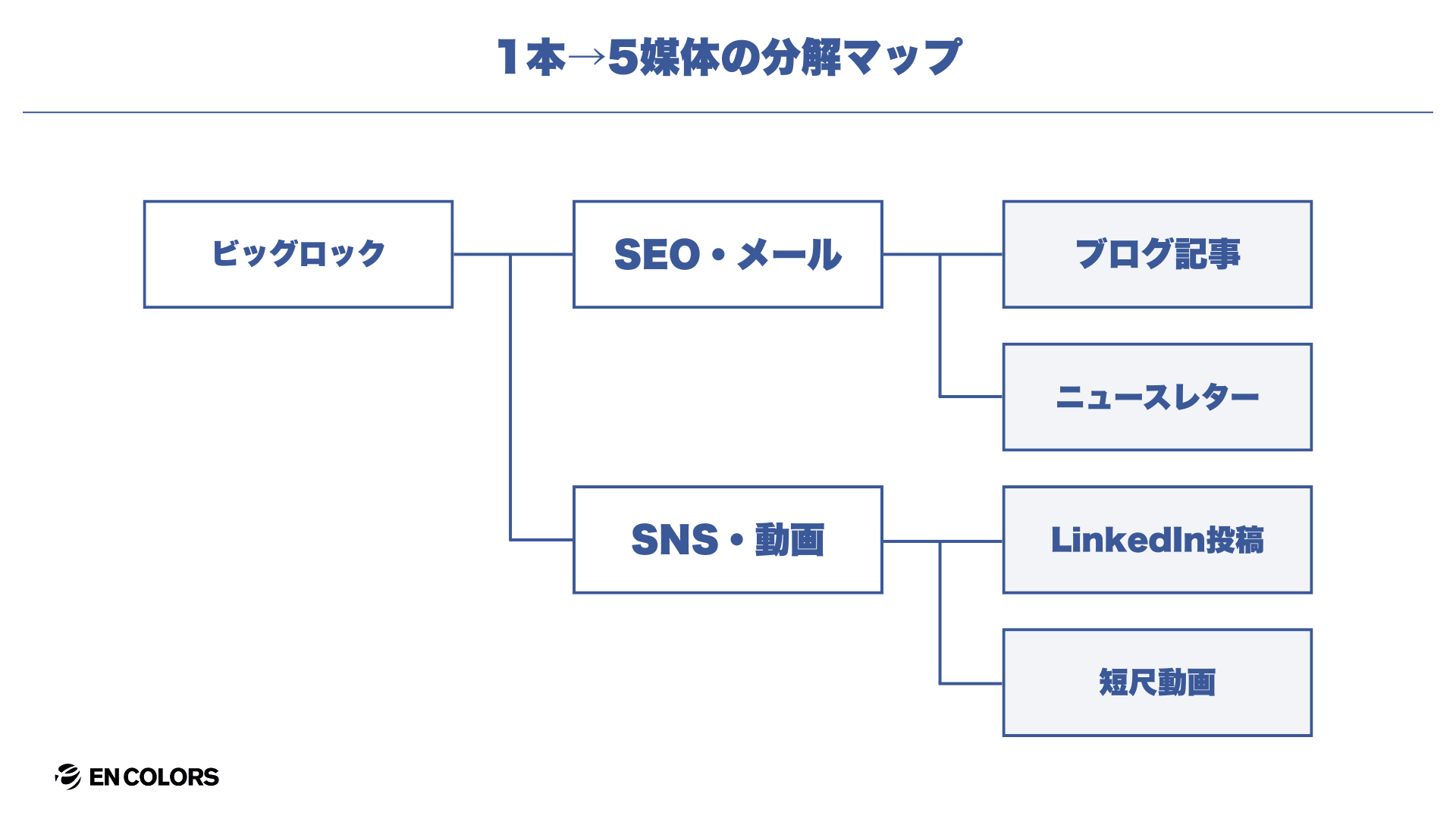 ビッグロックを1本作ったら、それを最低5つの媒体に分解して届けるのが次のステップです。1回の制作で終わらせず、複数チャネルへ展開することでコンテンツマーケティングのROIを最大化するBtoBオウンドメディアの運用方法です。