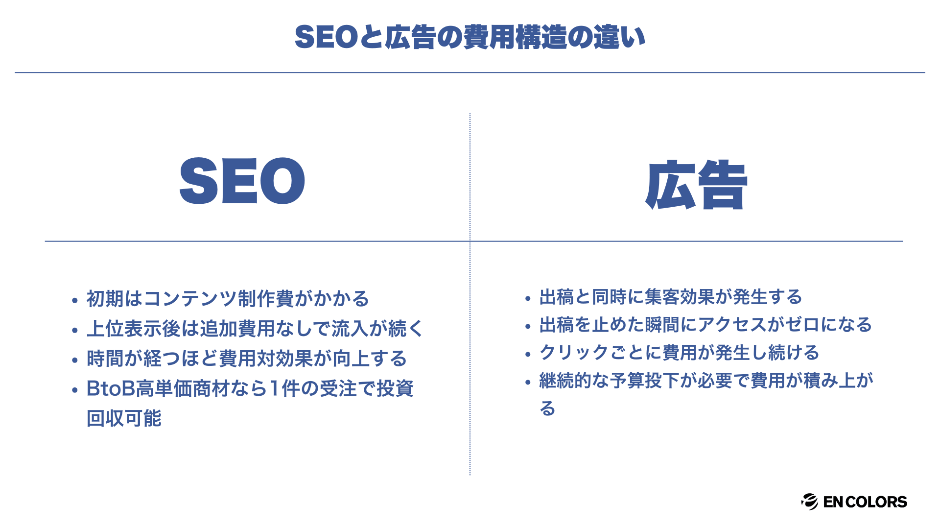 広告はクリックごとに費用が発生し続けますが、SEOは一度上位表示できれば追加の広告費なしで流入を得られるため、中長期的な費用対効果に優れています。
