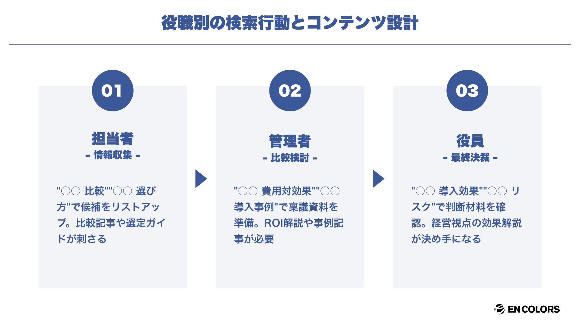 それぞれがどのフェーズでどんなキーワードを検索するのかを整理することで、コンテンツの方向性が明確になります。たとえば担当者は「○○ 比較」で検索し、決裁者は「○○ 導入効果」で検索するなど、役職によって検索行動が異なります。