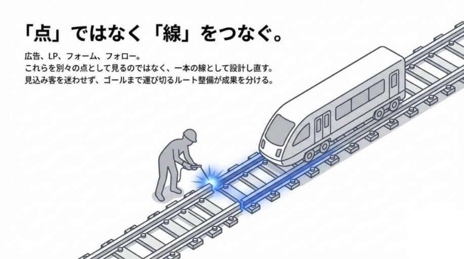 広告を「点」ではなく「線」で捉え、「広告→LP→信頼構築→問い合わせ→フォロー」という全体の流れを設計することが、導線設計の本質です。