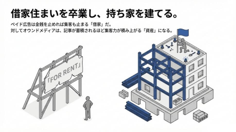 オウンドメディアは、広告が「家賃」なら、自社で建てる「持ち家」のような存在です。