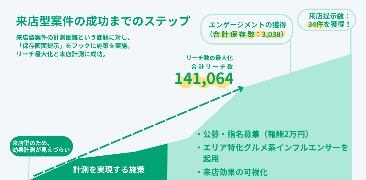 今回の施策では、エリア特化型のグルメ系インフルエンサーを活用し、「投稿の保存画面を提示すると特典がもらえる」という仕組みを導入。